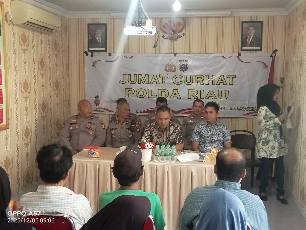 TIDAR NEWS- Wujud komitmen Polri dalam memperkuat pelayanan publik kembali ditunjukkan melalui kegiatan Jumat Curhat yang digelar Polda Riau bersama Polsek Pekanbaru Kota, Jumat (5/12/2025) di Aula Mapolsek Pekanbaru Kota, Jalan Sudirman. Kegiatan ini menjadi sarana dialog langsung antara Polisi dan masyarakat untuk mendengar, memahami, serta menindaklanjuti aspirasi warga.