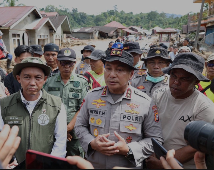 TIDAR NEWS.COM – Kapolda Riau Irjen Herry Heryawan, bersama Raja Juli Antoni, Menteri Kehutanan RI meninjau langsung ke lokasi bencana banjir bandang dan longsor di Salareh Aia, Kecamatan Palembayan, Kabupaten Agam, Sumatera Barat, Minggu, (30/11/25).